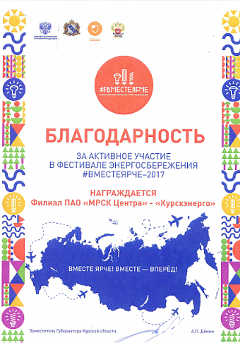 Presenting the award, Deputy Governor of the Kursk region Alexander Demin expressed hope for further fruitful cooperation with the Kursk branch of IDGC of Centre in the field of energy saving and, in particular, that it will become an active participant of festival events next year too.