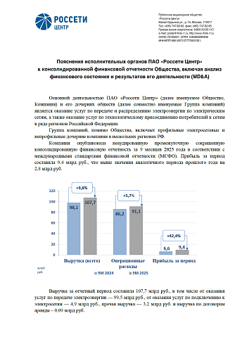 ПАО «Россети Центр» (код ценной бумаги – MRKC) опубликовало промежуточную сокращенную консолидированную финансовую отчетность (неаудированную) за три и девять месяцев, закончившихся 30 сентября 2025 года в соответствии с международными стандартами финансовой отчетности (МСФО).