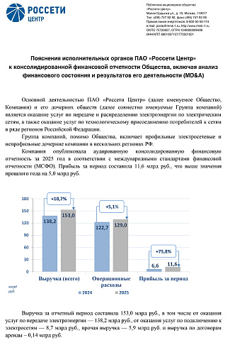 С консолидированной финансовой отчетностью Компании и пояснениями исполнительных органов к консолидированной финансовой отчетности, включая анализ финансового состояния и результатов его деятельности (MD&A), можно ознакомиться на сайте: https://mrsk-1.ru/information/statements/msfo/2025/.