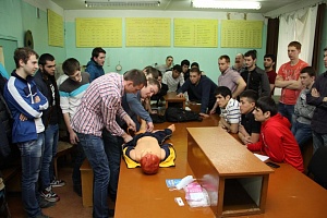 После проведенного инструктажа студенты отработали выполнение прекардиального удара, искусственной вентиляции легких и непрямого массажа сердца на манекене Гоше, несколько раз оживив пострадавшего. Дополнительно Гоше остановили кровотечение при ранении бедренной артерии с помощью жгута и оперативно сделанного валика из ткани.