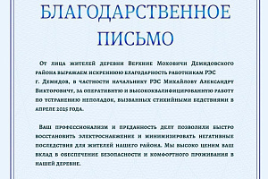 Энергетиков Демидовского района электрических сетей филиала ПАО «Россети Центр» - «Смоленскэнерго» поблагодарили за оперативную и высококвалифицированную работу по устранению технологических нарушений, вызванных непогодой в апреле 2025 года. Благодарственное письмо пришло от жителей деревни Верхние Моховичи. «Ваш профессионализм и преданность делу позволили быстро восстановить электроснабжение и минимизировать негативные последствия для жителей нашего района. Мы высоко ценим ваш вклад в обеспечение безопасности и комфортного проживания в нашей деревне», - отмечено в благодарственном письме.