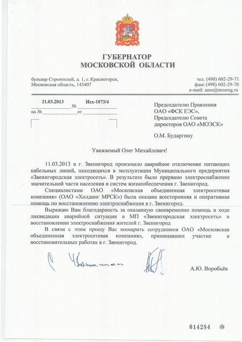 На имя Председателя Правления ОАО «ФСК ЕЭС» Олега Бударгина поступило письмо от временно исполняющего обязанности Губернатора Московской области Андрея Воробьева. В письме выражается благодарность за оказанную своевременную помощь в ликвидации аварийной ситуации на сетях МУП «Звенигородская электросеть» и восстановлении электроснабжения жителей Звенигорода.