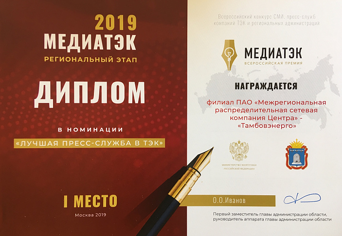 The public relations department of the branch “Rosseti Centre Tambovenergo” took the first place in the regional stage of the V All-Russian contest of media, press services of companies of the fuel and energy complex and regional administrations “MediaTEK-2019” in the nomination “The best press service in the fuel and energy complex”.
