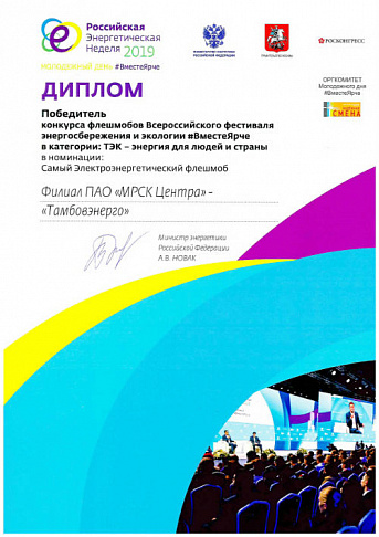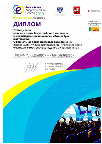 The branch “Rosseti Centre Tambovenergo” won the All-Russian contest for the best flash mob in support of the energy-saving lifestyle and work of power engineers in the nomination “Most Electric Power Flash Mob” and the song contest in the nomination “Best Corporate Performance of the Official Song of the Festival #TogetherBrighter by Employees of the Fuel and Energy Complex”. The award ceremony took place in Moscow as part of the Youth Day #TogetherBrighter of the International Forum “Russian Energy Week”.