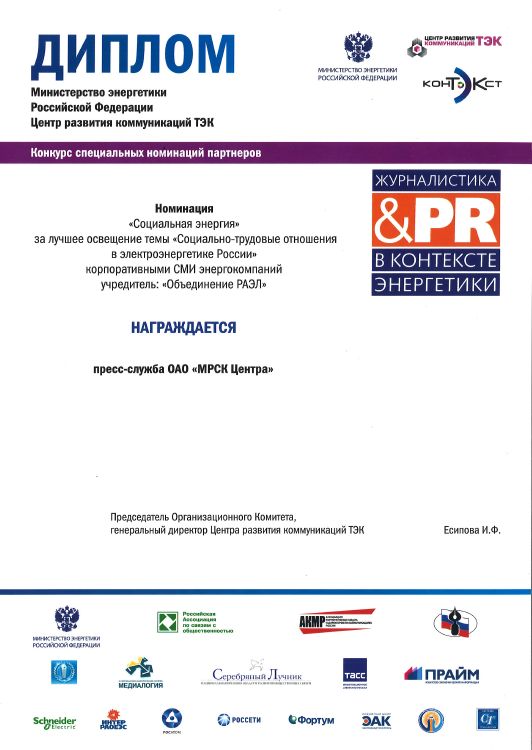 April 10, the TASS building in Moscow hosted a ceremony awarding KonTEKst among the press service of companies of the fuel and energy industry. The press service of IDGC of Centre won the contest in the category "Social Energy" for the best coverage of the topic "Social and labour relations in the electric power industry of Russia" by corporate media of power companies. The founder of the nomination "Social Energy" is the Russian Industrial Association of Employers in the Power Industry (RaEl Association).