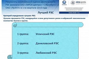 Основанием для комплексной оценки производственно-хозяйственной деятельности РЭС служит система показателей, используемая в ПАО «МРСК Центра» для мониторинга бизнес-процессов. В их числе выполнение ремонтной и инвестиционной программы, программы диагностики, уровень потерь электроэнергии в сетях, выполнение работ по технологическому присоединению, оказание дополнительных услуг. По результатам оценки составляется рейтинг РЭС, позволяющий оценивать и сравнивать результаты их деятельности.