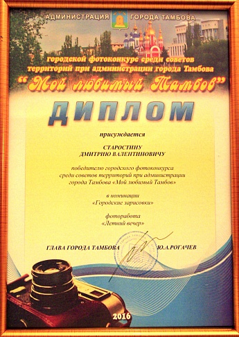 Дмитрий стал лучшим в номинации «Городские зарисовки» с фотоработой «Летний вечер», в которой запечатлел любимое место отдыха тамбовчан - набережную реки Цны во время заката. На торжественной церемонии награждения, прошедшей 17 июня в мэрии Тамбова, диплом победителя ему вручил замглавы городской администрации по вопросам социальной политики Сергей Кузнецов.
