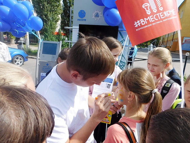 Для детей работники филиала подготовили специальную программу: в нее входили аквавизаж и конкурс рисунка на асфальте на тему энергосбережения. В то время как одни ребята с удовольствием подставляли щеки и руки для ярких рисунков молнии или лампочки, другие сами старательно рисовали цветными мелками дома со светящимися окнами, энергосберегающие лампочки и ветровые генераторы. Абсолютно все юные художники получили на память подарки, а также полезные брошюры с основными правилами энергосбережения и электробезопасности в быту.
