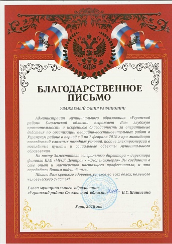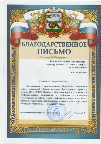 Администрации муниципальных образований Вяземского, Гагаринского и Угранского района Смоленской области поблагодарили заместителя генерального директора – директора филиала ПАО «МРСК Центра» - «Смоленскэнерго» Сабира Агамалиева и весь коллектив за профессионализм и безупречную работу в период ликвидации последствий снегопада.