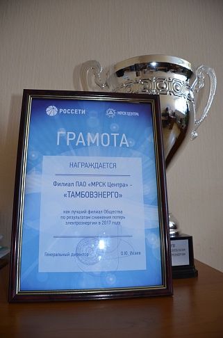 Филиал ПАО «МРСК Центра» - «Тамбовэнерго» по итогам 2017 года продемонстрировал лучшие среди филиалов Общества показатели снижения потерь электроэнергии. За достигнутые успехи Тамбовэнерго присвоен статус лучшего филиала ПАО «МРСК Центра» по снижению потерь, предприятие награждено кубком и почетной грамотой.