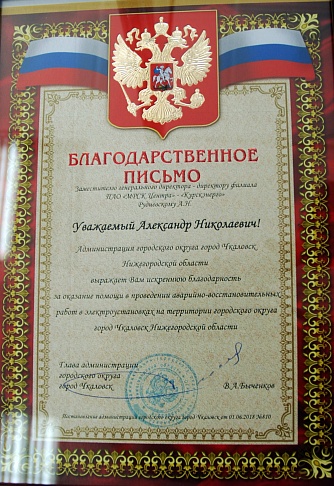 В адрес филиала ПАО «МРСК Центра» – «Курскэнерго» поступило благодарственное письмо от главы администрации города Чкаловск Нижегородской области Валерия Быченкова. Руководитель муниципалитета благодарит предприятие и его сотрудников за помощь в оперативном восстановлении энергоснабжения, нарушенного непогодой.