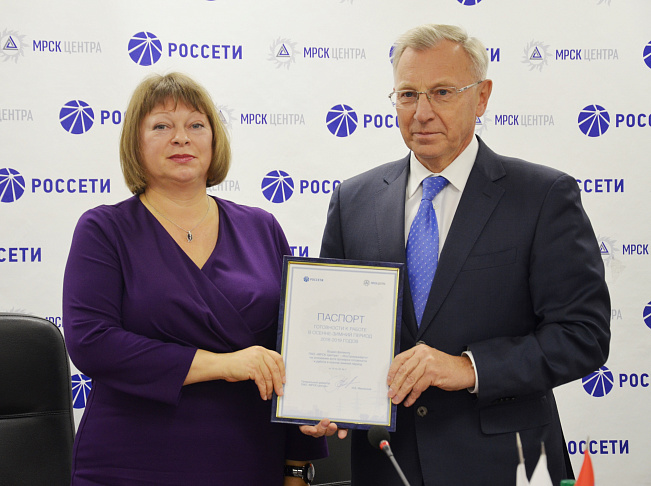 В филиале ПАО «МРСК Центра» - «Костромаэнерго» прошло заседание межведомственной комиссии по оценке готовности предприятия к осенне-зимнему периоду (ОЗП). По его итогам председатель комиссии – начальник управления производственной безопасности ПАО "МРСК Центра" Елена Калинина вручила заместителю генерального директора-директору филиала ПАО МРСК Центра»-«Костромаэнерго» Александру Глебову Паспорт готовности к работе в ОЗП 2018-2019 гг. - документ, подтверждающий готовность к работе в период осенне-зимнего максимума нагрузок.