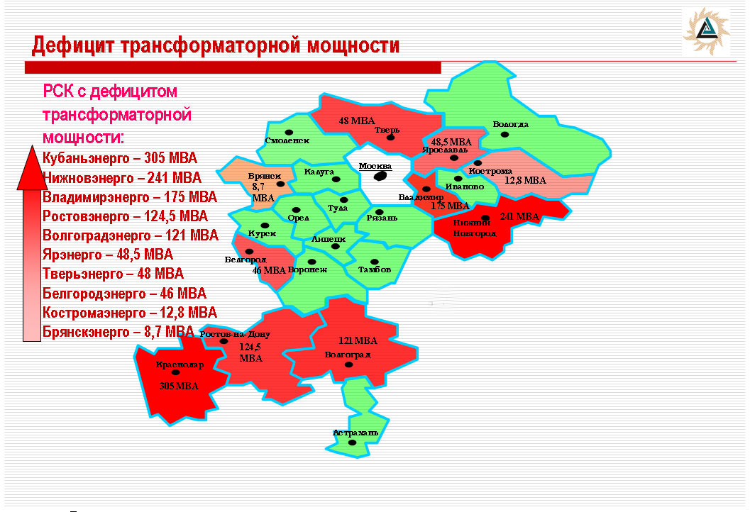 На сегодняшний момент суммарный дефицит трансформаторной мощности для присоединения новых потребителей в распределительных сетях компаний, входящих в состав ОАО «МРСК Центра и Северного Кавказа» составляет 1130,5 МВА (мегавольтампер). Как отмечает технический директор компании Сергей Шумахер, особенно остро эта проблема стоит в ОАО «Кубаньэнерго» - дефицит 305 МВА, ОАО «Нижновэнерго» - 241 МВА и ОАО «Владимирэнерго» - 175 МВА соответственно.