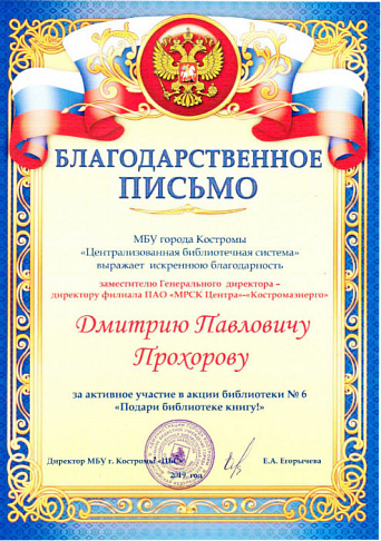 В адрес филиала «Россети Центр Костромаэнерго» поступило благодарственное письмо от руководства библиотеки №6 г. Костромы. Энергетиков благодарят за литературу, которую они передали в дар этому учреждению культуры в рамках акции «Подари ребенку книгу».