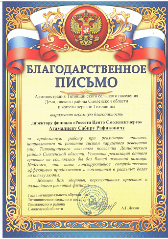 Филиал «Россети Центр Смоленскэнерго» получил благодарность от Администрации Титовщинского сельского поселения Демидовского района Смоленской области и жителей д. Титовщина за проделанную работу при реализации проекта, направленного на развитие систем наружного освещения улиц. «Успешная реализация данного проекта не состоялась бы без Вашей активной помощи. Надеемся, что наше конструктивное сотрудничество продолжится и воплотится в реальных делах на пользу людям», - отметил глава муниципального образования Александр Яскин в письме директору Смоленскэнерго Сабиру Агамалиеву.