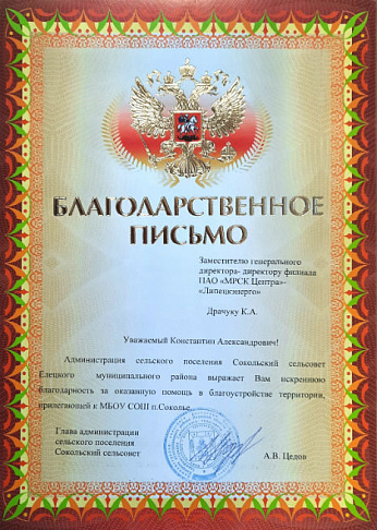 На имя заместителя генерального директора – директора филиала «Россети Центр Липецкэнерго» Константина Драчука поступила благодарность от главы администрации сельского поселения Сокольский сельсовет Елецкого муниципального района Александра Цедова. Руководитель муниципалитета благодарит энергетиков за оказанную помощь в благоустройстве территории, прилегающей к МБОУ СОШ поселка Соколье.