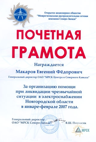 Еще одно благодарственное письмо за подписью генерального директора ОАО «МРСК Северо-Запада» Вениамина Пинхасика, цитирую: «за оперативное реагирование и помощь, оказанную при ликвидации последствий чрезвычайной ситуации в электроснабжении Новгородской области, вызванной стихийными природными явлениями в январе – феврале 2007 года», адресовано коллективам предприятий Вологодской области.