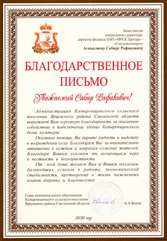 Администрация Капыревщинского сельского поселения Ярцевского района Смоленской области поблагодарила директора филиала «Россети Центр Смоленскэнерго» Сабира Агамалиева за содействие в подключении здания Капыревщинского дома культуры.