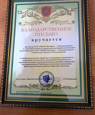 В адрес энергетиков филиала «Россети Центр Липецкэнерго» поступило благодарственное письмо за подписью и.о. главы Максатихинского района Станислава Черкасова. Муниципальные власти поблагодарили бригады филиала за добросовестный труд при ликвидации аварийных ситуаций, выполнение масштабной работы по строительству и восстановлению электроснабжения на территории Рыбинского сельского поселения Максатихинского района Тверской области.