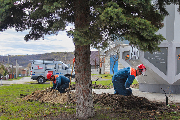 Для освещения стелы энергетики проложили кабельную линию, смонтировали шкаф управления наружным освещением по периметру площадки, а также у пешеходного перехода, ведущего к памятному месту, установили светодиодные прожекторы.