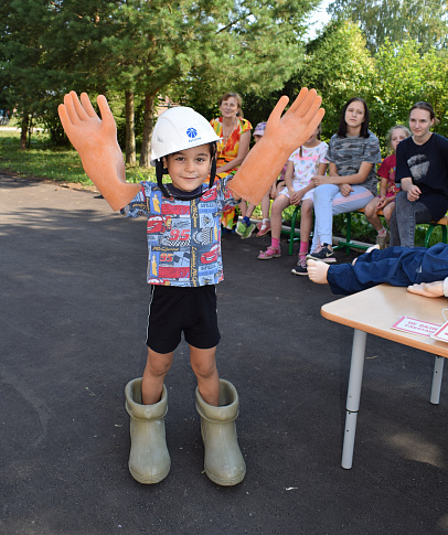 Детвора прошлась «гусиным» шагом, которым нужно выходить из опасной зоны действия электричества, увидела и смогла примерить костюм и защитные средства электромонтёра. Закрепить полученные знания детям помогла веселая и поучительная викторина, на вопросы которой они отвечали хором. Продолжился праздник веселыми играми, спортивными и интеллектуальными конкурсами.