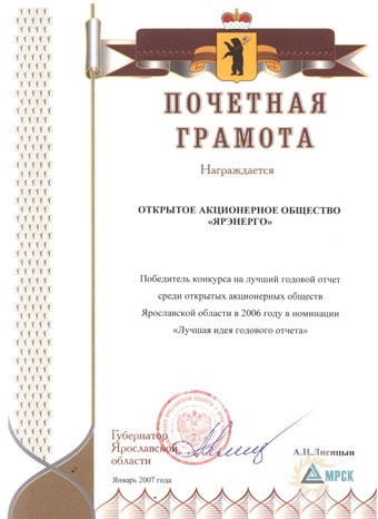 В жюри конкурса на «Лучший годовой отчет» среди открытых акционерных обществ Ярославской области по итогам деятельности за 2006 год вошли профессиональные специалисты фондового рынка в лице представителей фондовых бирж РТС и ММВБ, а также руководители администрации области, территориального отдела регионального отделения Федеральной службы по финансовым рынкам России в ЦФО по Ярославской области, Российского института директоров и Регионального института корпоративного управления.