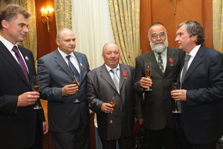 Во время торжественной церемонии награждения: справа налево - Президент ОАО "НК "Роснефть" И.И. Сечин, электромонтер оперативно-выездной бригады Михайловского района электрических сетей производственного отделения "Рязанские электрические сети" филиала ОАО "МРСК Центра и Приволжья" - "Рязаньэнерго" В.И. Сошин, электромонтер по испытаниям и измерениям производственного отделения "Вятско-Полянские электрические сети " филиала ОАО "МРСК Центра и Приволжья" - "Кировэнерго" Л.А. Злобин, заместитель генерального директора - главный инженер ОАО "Кубаньэнерго" П.В. Зинченко, Генеральный директор ОАО "Холдинг МРСК" Н.Н. Швец.