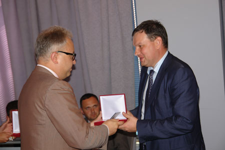 Исполнительный директор ОАО «Холдинг МРСК» Андрей Муров вручил Почетные знаки «За безупречную работу в распределительно-сетевом комплексе» заместителю исполнительного директора по корпоративному управлению Алексею Курочкину, заместителю исполнительного директора по безопасности Владимиру Шукшину, директору по правовым вопросам и взаимодействию с субъектами рынков электроэнергии Сергею Васильеву.