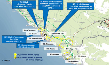 В рамках реализации Программы строительства олимпийских объектов и развития города Сочи, как горноклиматического курорта, ОАО «Кубаньэнерго» ведет строительство и реконструкцию 16 объектов. Среди них — пять подстанций 110 кВ, общая мощность которых составит 340 МВА. На трех из них работы уже завершены: реконструирована подстанция «Родниковая», построены подстанции «Бытха» и «Вишневая». Строительство подстанции 110 кВ «Бочаров ручей» будет завершено уже в августе, а реконструкция «Верещагинской» — в декабре 2012 года. Олимпийские подстанции оснащаются передовым микропроцессорным оборудованием релейной защиты и автоматики, устройствами телемеханики и связи. При разработке проектов выполнены требования к сейсмостойкости: все возводимые и реконструируемые подстанции и воздушные линии электропередачи способны выдержать подземные толчки силой в девять баллов.